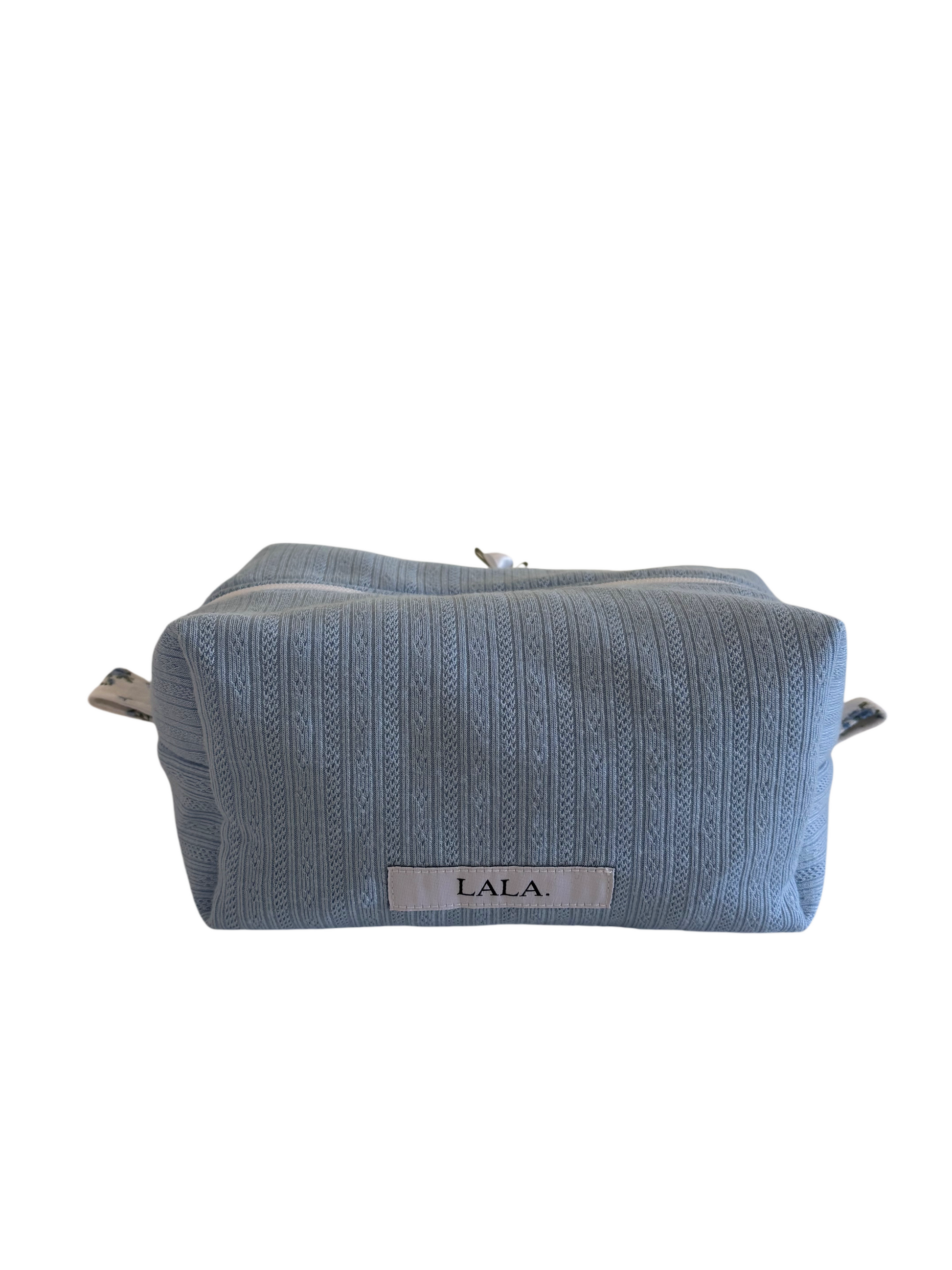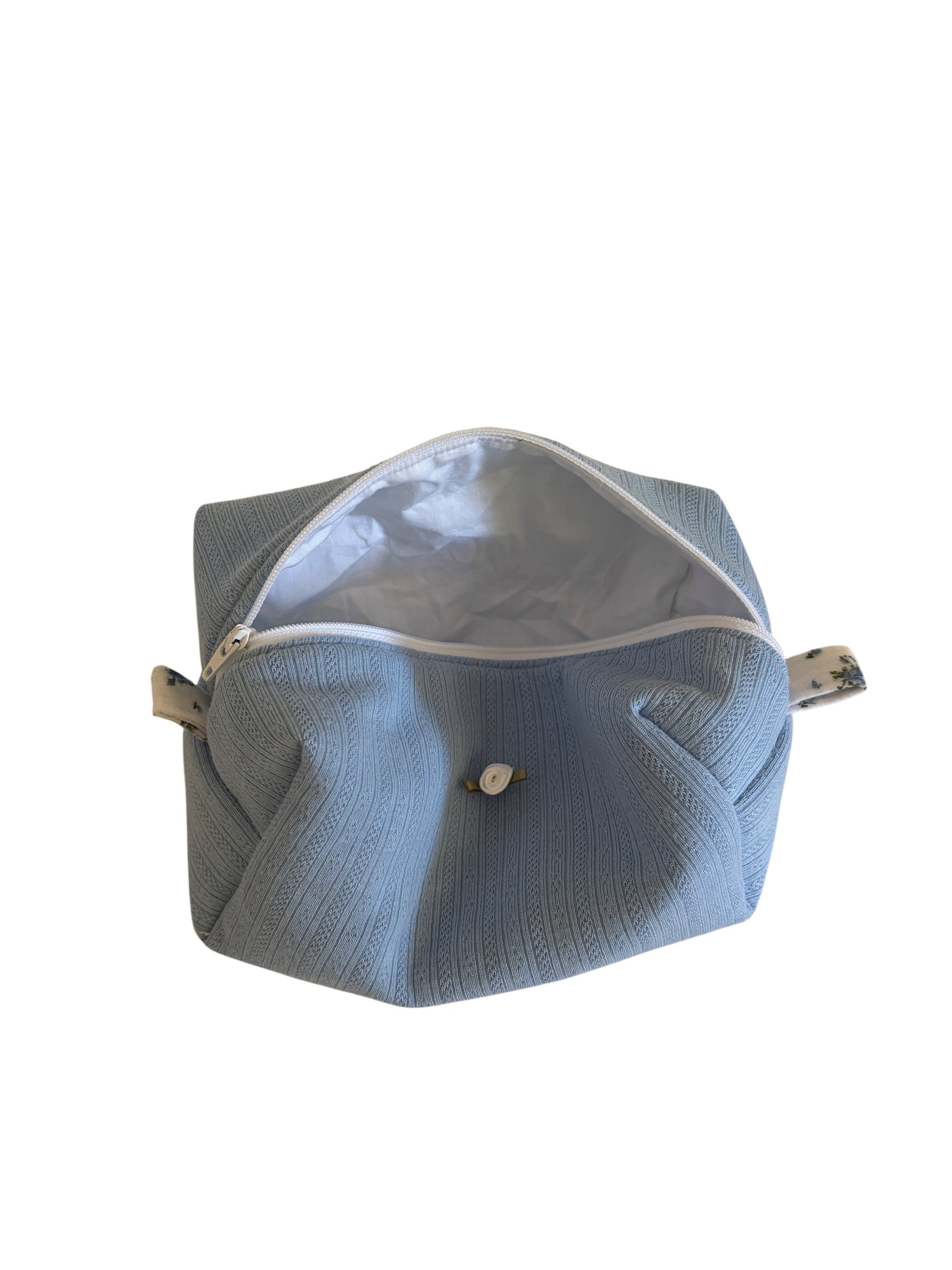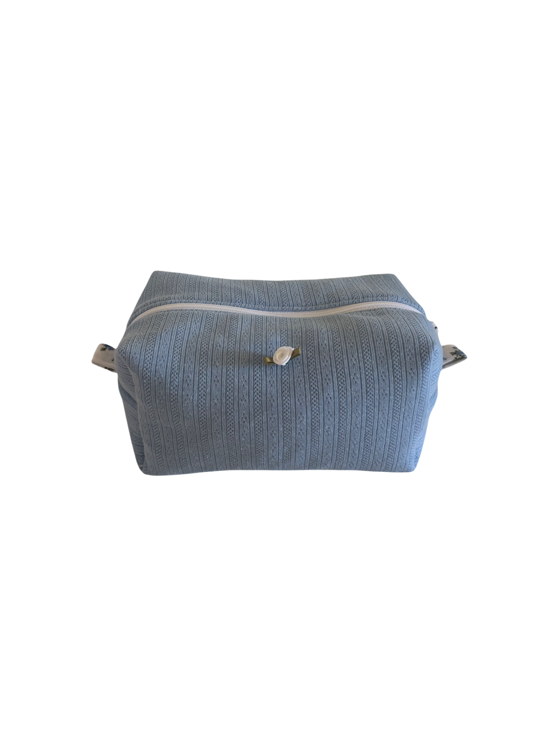 Our Soft Blue Boxy Pouch features a soft blue pointelle giving it the ability to stretch and move around. This bag is perfect for carrying your makeup, toiletries, skincare, etc.